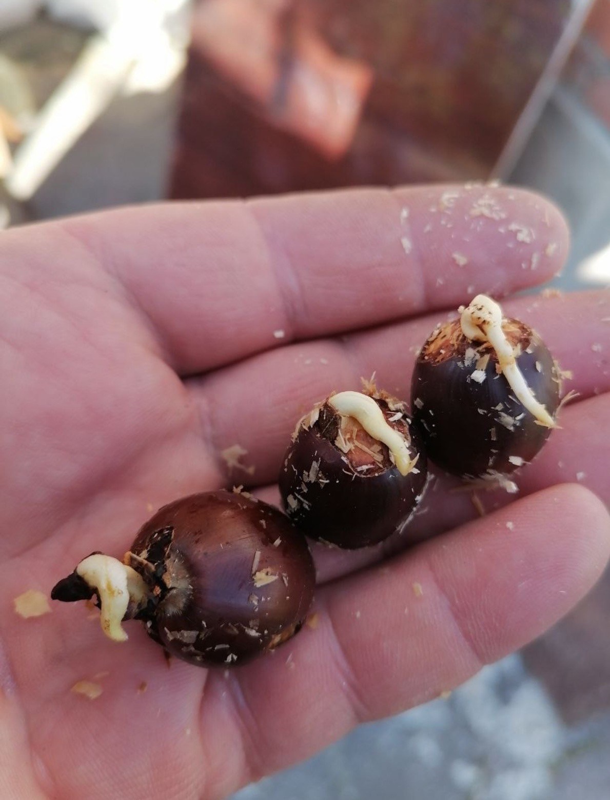 В интернете я вычитал, что для облегчения прорастания, желудям можно аккуратно повреждать семенную оболочку. Ножом я срезал верхушки с непроросших желудей, и через несколько дней два из них проросли к великой моей радости!