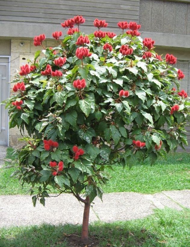 Описание. Кустарник или небольшое дерево с плотной округлой кроной высотой обычно 1,5-3 м. Листья крупные, сердцевидные, с заметными красноватыми жилками. Соцветия на концах побегов, цветки нежно-розовые, с тычинками золотистого оттенка. Плоды – овально-шаровидные коробочки с мягкими шипиками, собранные в кисти, при созревании раскрываются и показывают многочисленные семена конической формы с яркой восковой оболочкой. Культура светолюбива и теплолюбива, хорошо реагирует на регулярные подкормки и формирующую прищипку. В комнатной и тепличной культуре формирует семенные коробочки при достаточном освещении и тепле.